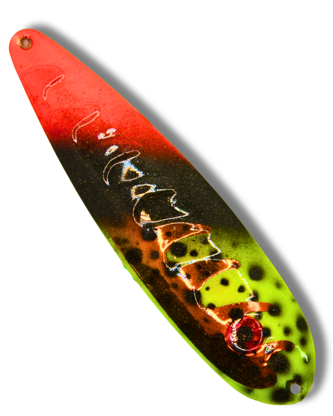 These high quality trolling spoons are designed to elevate your fishing experience. They have an irresistible fluttering action that sets them apart. At TNT Fishing Lures we use only quality American made blanks, solid stainless heavy duty split rings, 2x strength VMC treble hooks, high quality paints and a UV protective durable top coat.
