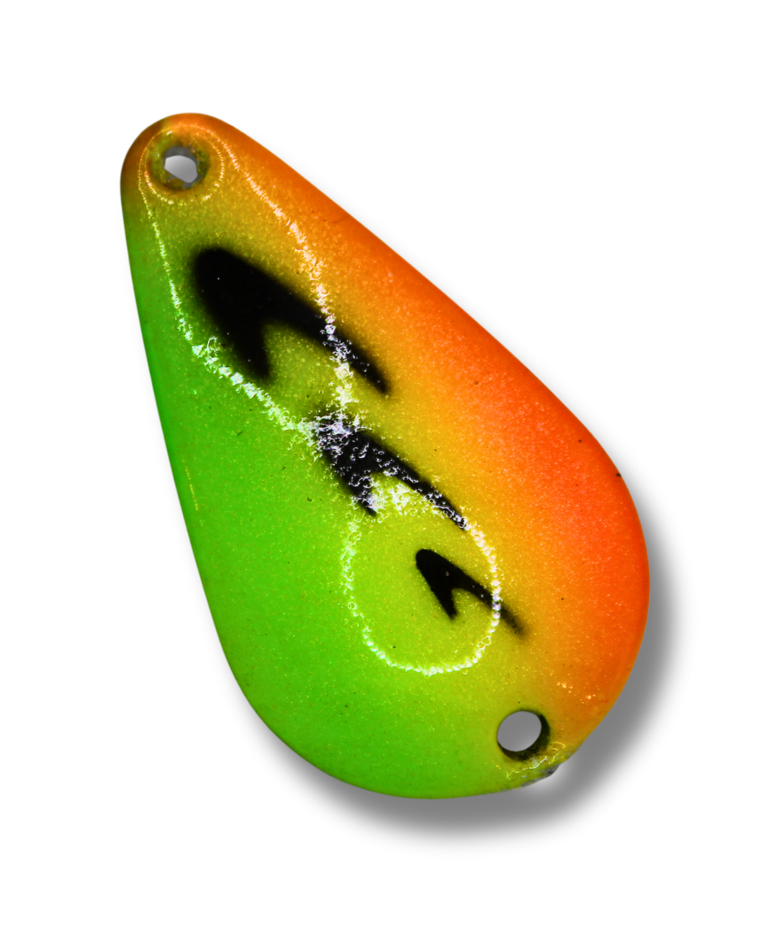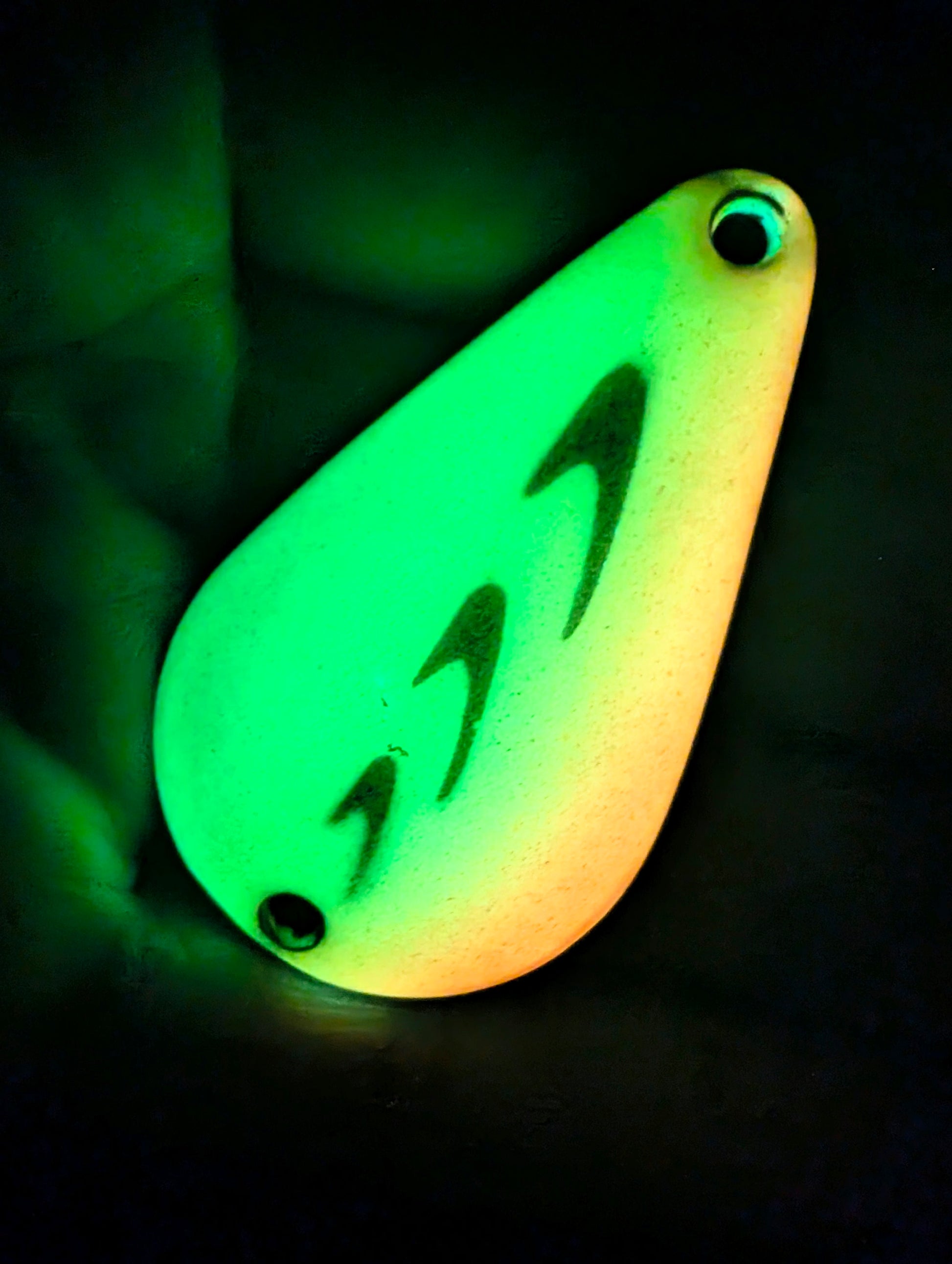 This ultra glow casting spoon features a multi-species pattern that is built for the river, lake, shore, or pier. Featuring our new glow product, holographic vinyl and UV florescent colours.