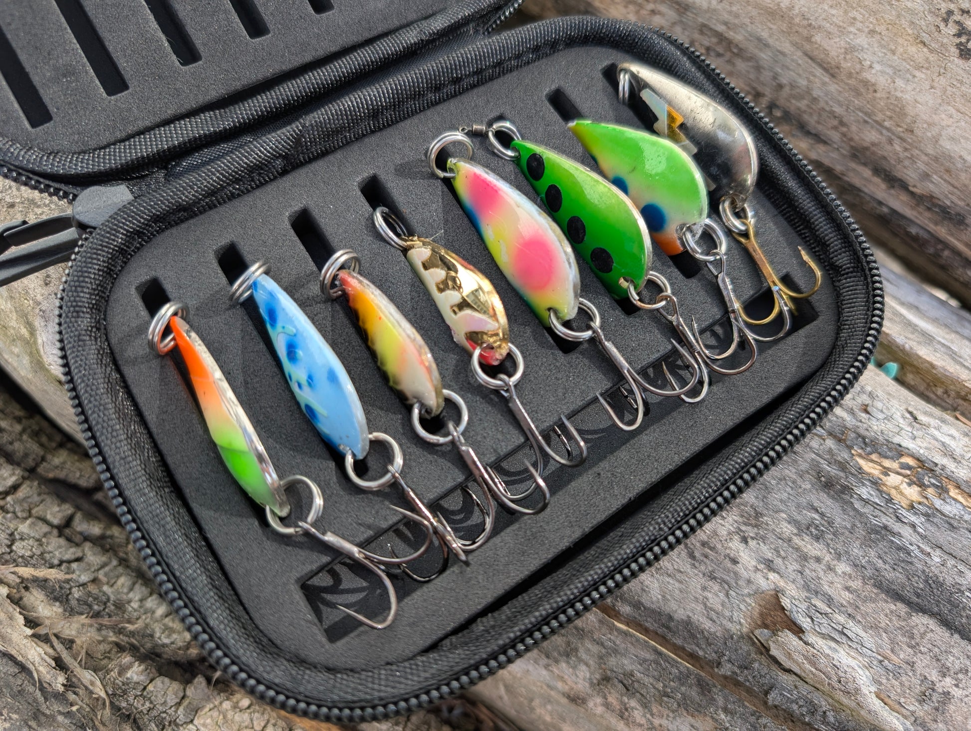These killer casting spoon cases are made for the rugged adventurer, river angler, pier/shore fisherman or the backcountry angler. These cases feature true DTF logo artwork on the front side done by our team member at Digital Flair & Design. They also feature a zipper closure and a clip at the top end for easy attachment to your box, bag or waders. This case comfortable holds 8 of our casting spoons (1/4,1/2 or 5/8 sizing). They are available EMPTY OR FULL.