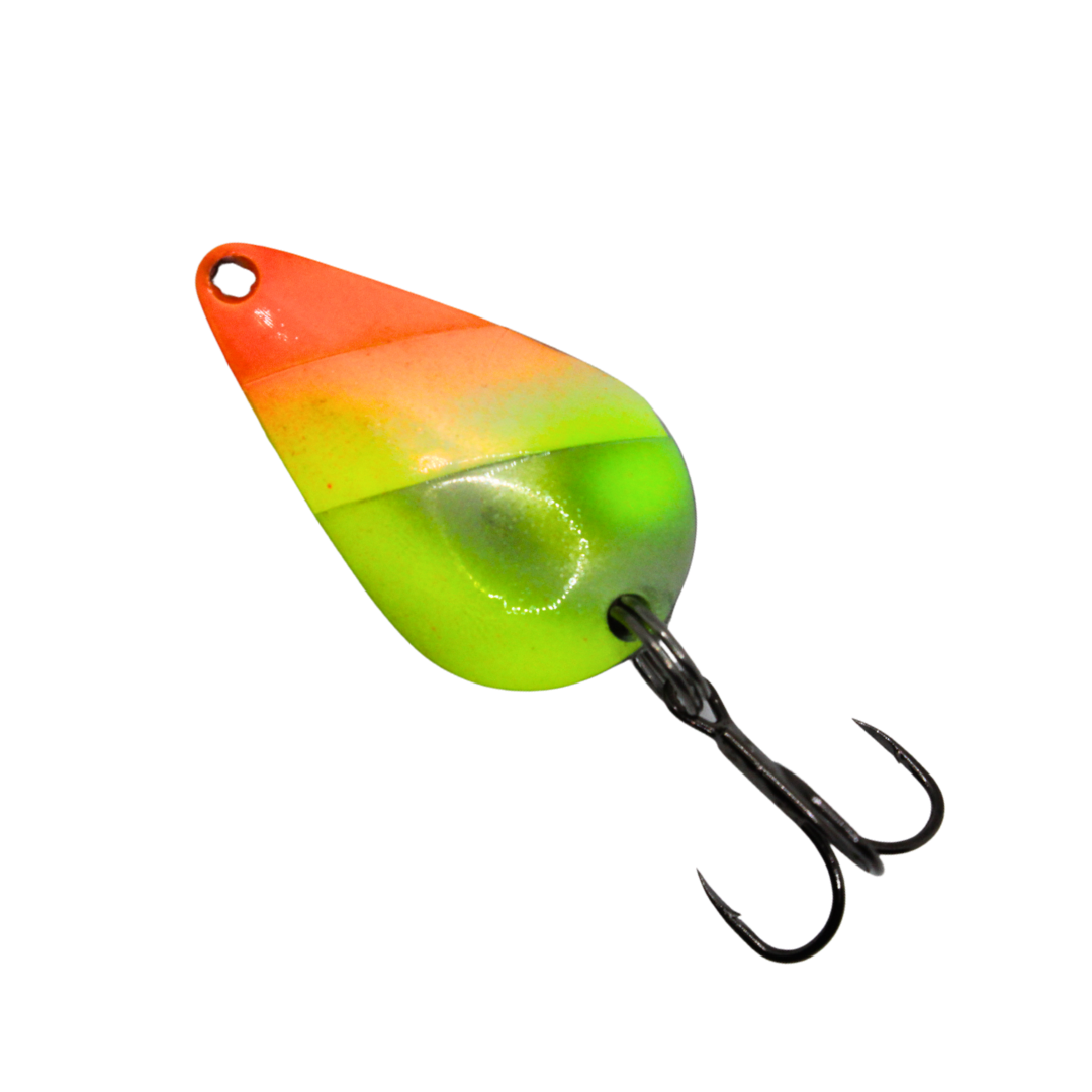 Distinctive tear drop shaped casting spoons in two versatile sizes, featuring a unique, fish attracting wobbling action, durable 2X strength Torpedo hooks, durable split rings and our "Fish On" topcoat.