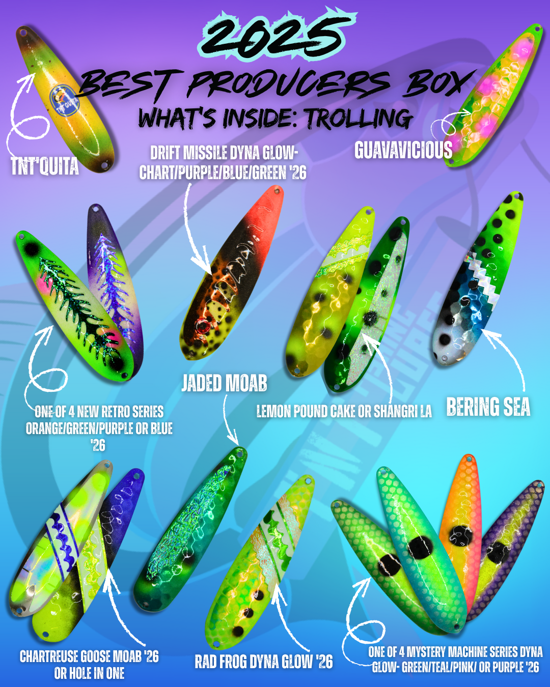 UV TACKLEINABOX Collaboration boxes will contain the trolling spoons listed above as well as the box itself.Ā